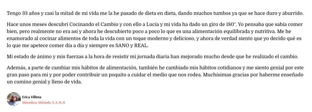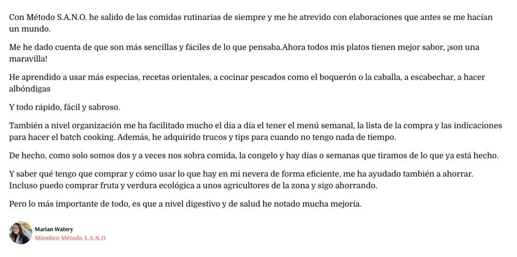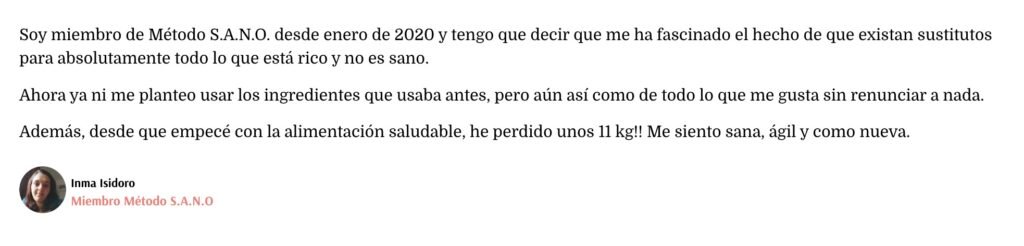 Si realmente tienes interés en dar un giro de 180° a tu nutrición, método S.A.N.O. es, sin duda, el mejor curso del mercado ahora mismo. No solo vas a encontrar recetas de comida saludable que te ayudarán a alimentarte mejor, sino que el solo hecho de adquirir la membresía te propiciará cambios de hábito en diferentes facetas de tu vida: podrás acceder a todo tipo de talleres relacionados con las buenas prácticas en materia de deporte, suelo pélvico, gestión del estrés, cosmética natural…