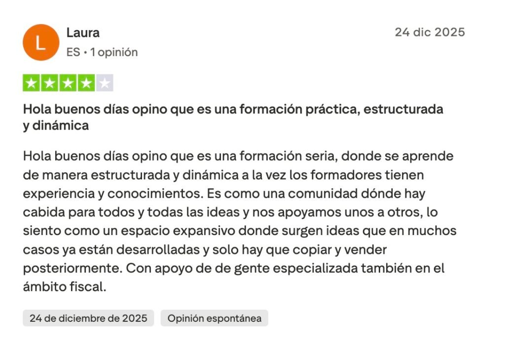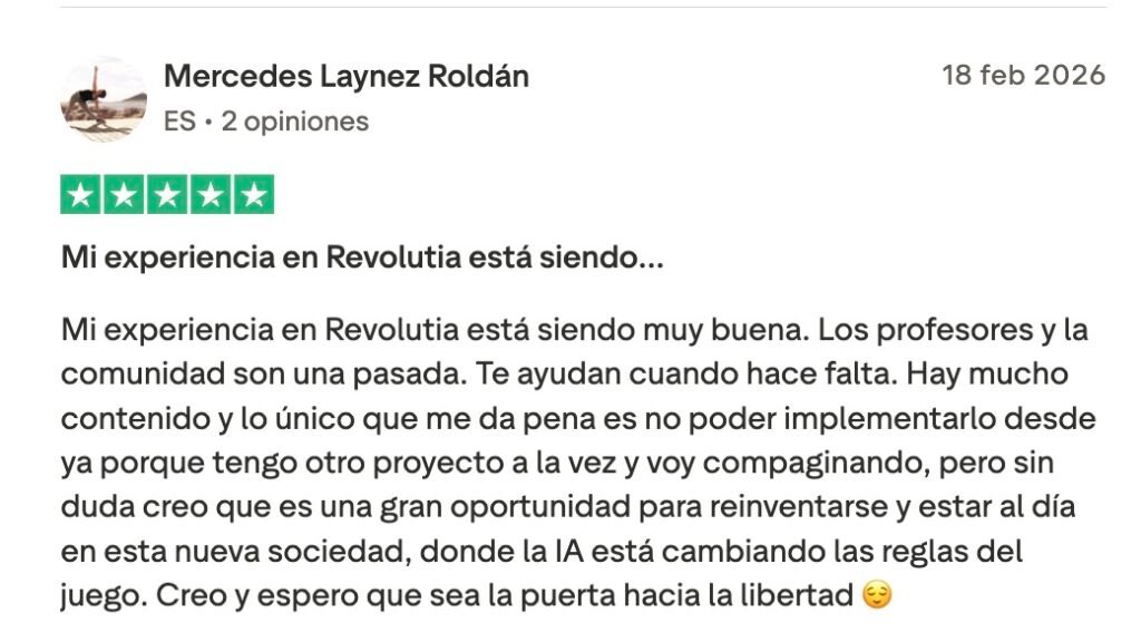 A la hora de comprar cualquier formación, es esencial informarse previamente sobre lo que vas a encontrar en el curso. Para ello, una de las mejores fuentes de información es preguntar o descubrir qué piensan los alumnos que aún están cursando el programa o lo han finalizado. De esta manera te aseguras de tener todos los datos necesarios para poder tomar la mejor decisión. A continuación, tienes unos ejemplos de personas que han dejado su feedback en Trustpilot. La valoración es altamente positiva, reforzando de esta manera la sensación de que Revolutia es un curso que cumple con las expectativas.